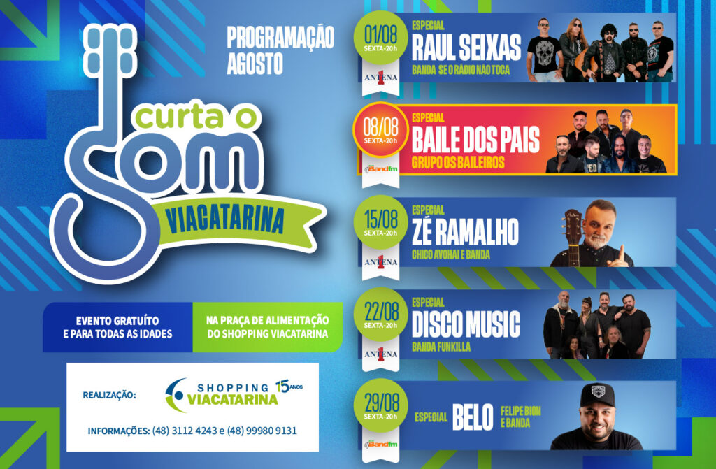 Agosto tem o Dia dos Pais, tem 5 sextas, então, tem serão 5 grandes shows no SHOPPING VIACATARINA: 01/08: Especial RAUL SEIXAS com a banda Se o Rádio Não Toca. 08/08: BAILE DO DIA DOS PAIS com o Grupo OS BAILEIROS. 15/08: Especial ZÉ RAMALHO com Chico Avohai e banda. 22/08: Especial DISCO MUSIC com […]