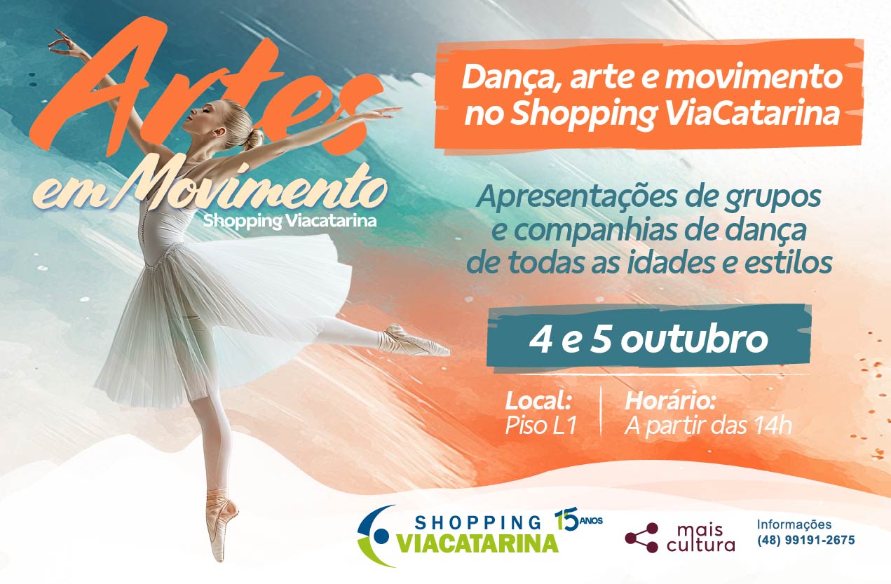 O Festival Artes e Movimento volta para a agenda de eventos do ViaCatarina em Palhoça e acontece nos dias 04 e 05 de outubro, sábado e domingo, no espaço do piso L1 com apresentações a partir das 14h com a participação de centenas de bailarinos de todas as idades.